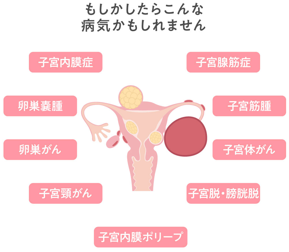 生理異常・生理痛・バルトリン腺嚢胞・腟炎・更年期障害・子宮筋腫・子宮内膜症・子宮腺筋症・卵巣腫瘍