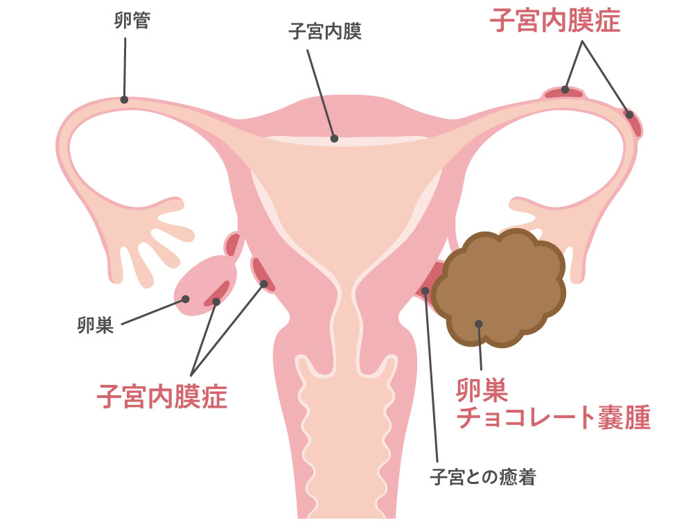 卵巣やダグラス窩(子宮と直腸の間のくぼみ)、仙骨子宮靭帯(子宮を後ろから支える靭帯)、膀胱子宮窩(子宮と膀胱の間のくぼみ)などです。子宮の筋層内にできた場合は子宮腺筋症といいます。